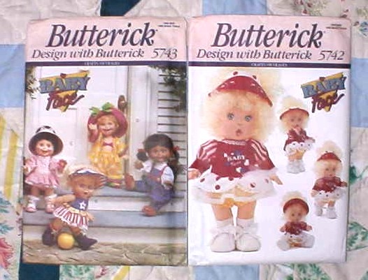 Baby Face sewing patterns made by Butterick. Pattern 4743 was for four different mulit part outfits, which included hats and jacket. Pattern 5742 was for making a Baby Face Suzie ragdoll with outfit, complete with shoes. It included iron on transfers for the dolls face and logo for the outfit.