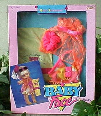 Galoob made six different outfit sets and a diaper pack for the Baby Face dolls. The idea was that Baby Face would be a "fashion" baby and they would provide many outfits a la Barbie for little girls to dress thier Baby Face dolls.