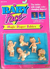 The Baby Face Magic Diaper Babies were Magic Diaper Babies rebranded with the Baby Face logo to stimulate sales here in the US. Although Magic Diaper Babies were a very hot seller abroad, the sales here were lukewarm. I think that Galoob marketing thought that my linking the Magic Diaper Babies to their number one selling Baby Face dolls would help sales here. We will never know if that strategy was correct, as Baby Face were cancelled before the sales of the Baby Face branded Diaper Babies could be evaluated. This is a complete set of the Baby Face branded Magic Diaper Babies MOC. Click on any image to see a larger view.